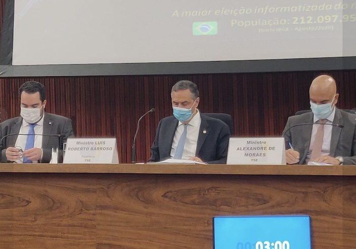 Compondo a mesa o Deputado Paulo Martins, Ministros Luis Roberto Barroso e Alexandre de Moraes.